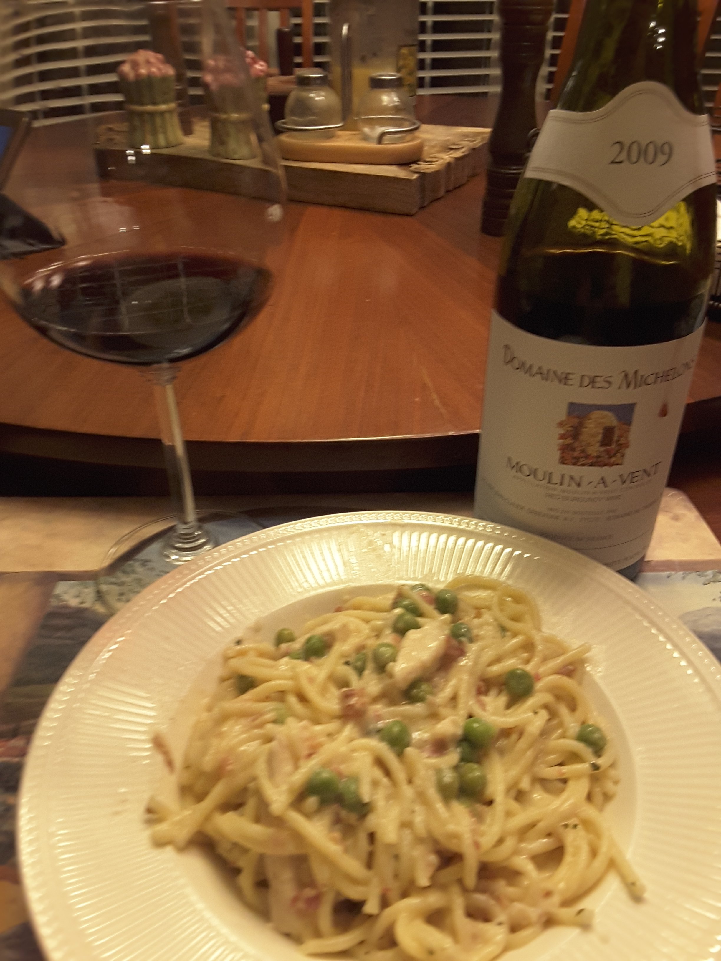 Elegant, cherry and plum- rasin, is that licorice-yes it is, follow through with hints of cedar. Enjoy. Domaine des Michelons, Moulin A Vent And of course our version of carbonara